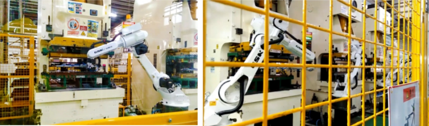 * 5 robots are used respectively to feed the 4 punches, and the product finally flows out of the conveying line, and is picked up by someone.