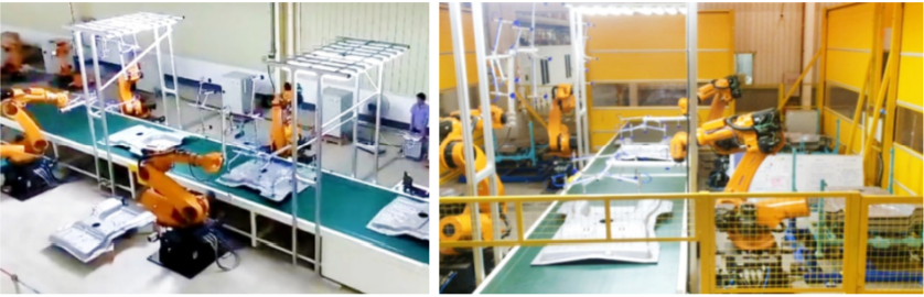 * Production line configuration, 4 GSK RB165 robots, two conveying belt lines, two sets of positioning capture systems of visual movement, 4 sets of workpiece grabbing endworking pick up devices and one set of production line control system;