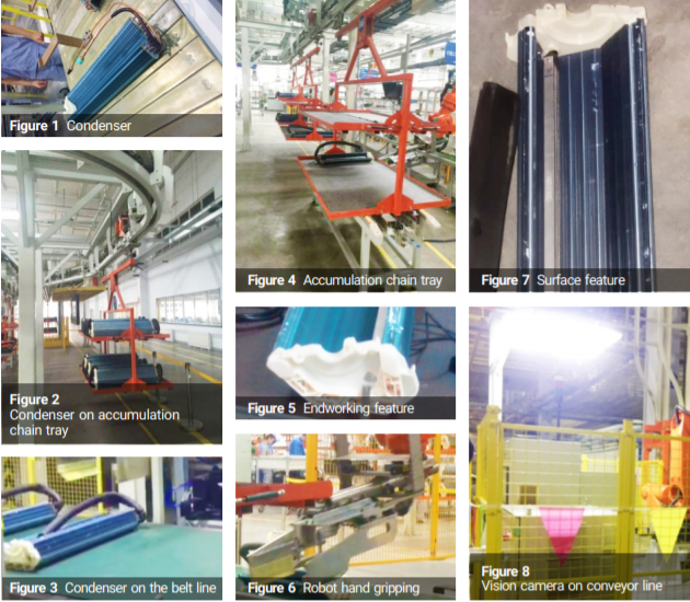 *The robot gripping scheme is guided by 3D vision, the robot hand gripping adopts the simulated structure, and the contact part of the condenser adopts soft polyurethane; ? The condenser grabbing on the accumulation chain tray is guided and positioned by identifying the white plastic feature of the condenser endworking part, and the camera is mounted on the robot hand gripper;
